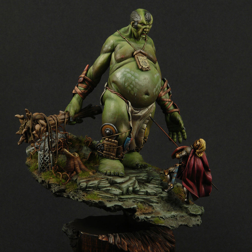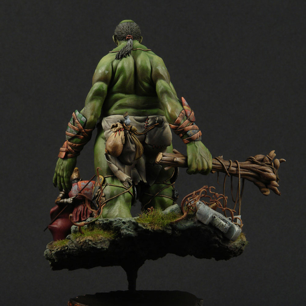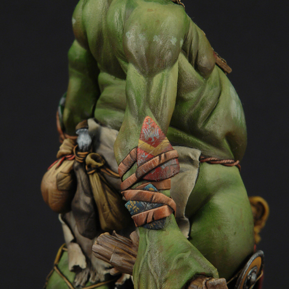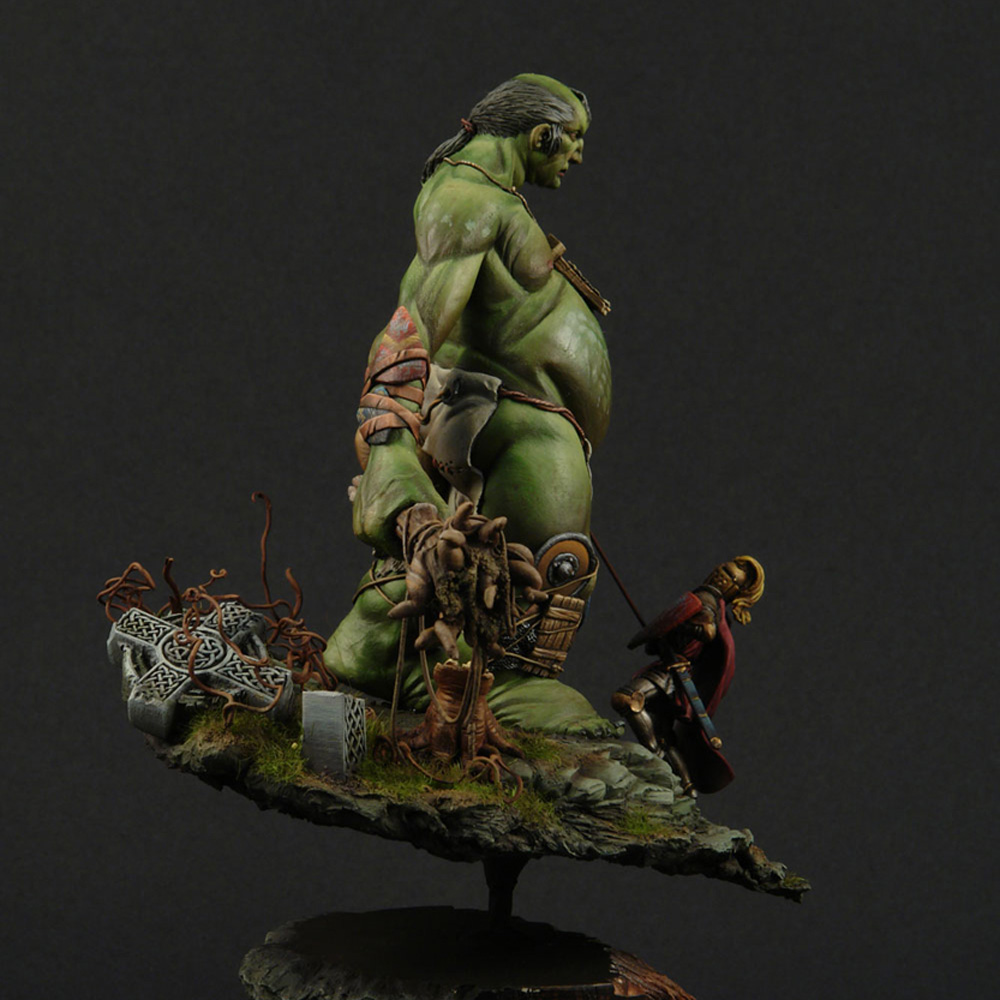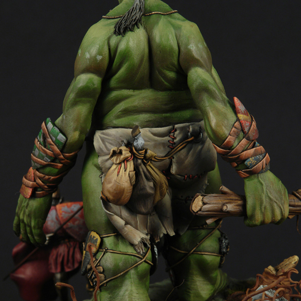 The giant’s anatomy is the fascinating and outstanding feature of the sculpt. Fat and short legs for balance, long arms so he doesn’t have to bend over when he wants to grab something (since he is very tall), huge belly since he eats a lot and a small head because he has such a small brain. The shields of defeated knights adorn his arms and legs for protection and he always carries with him a snack or two (2 sacks with food and a horses leg).