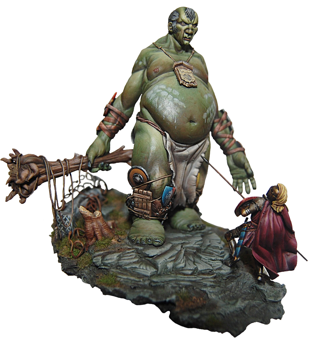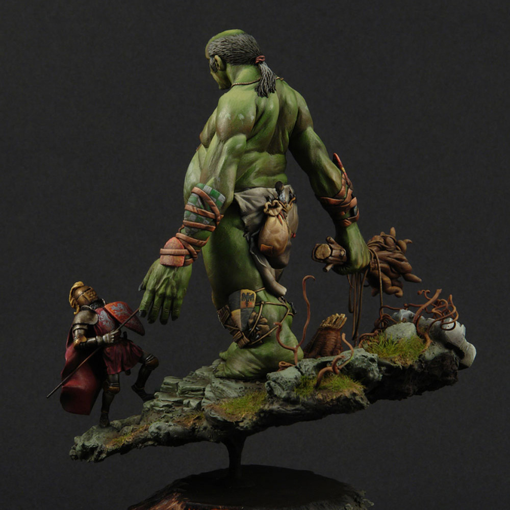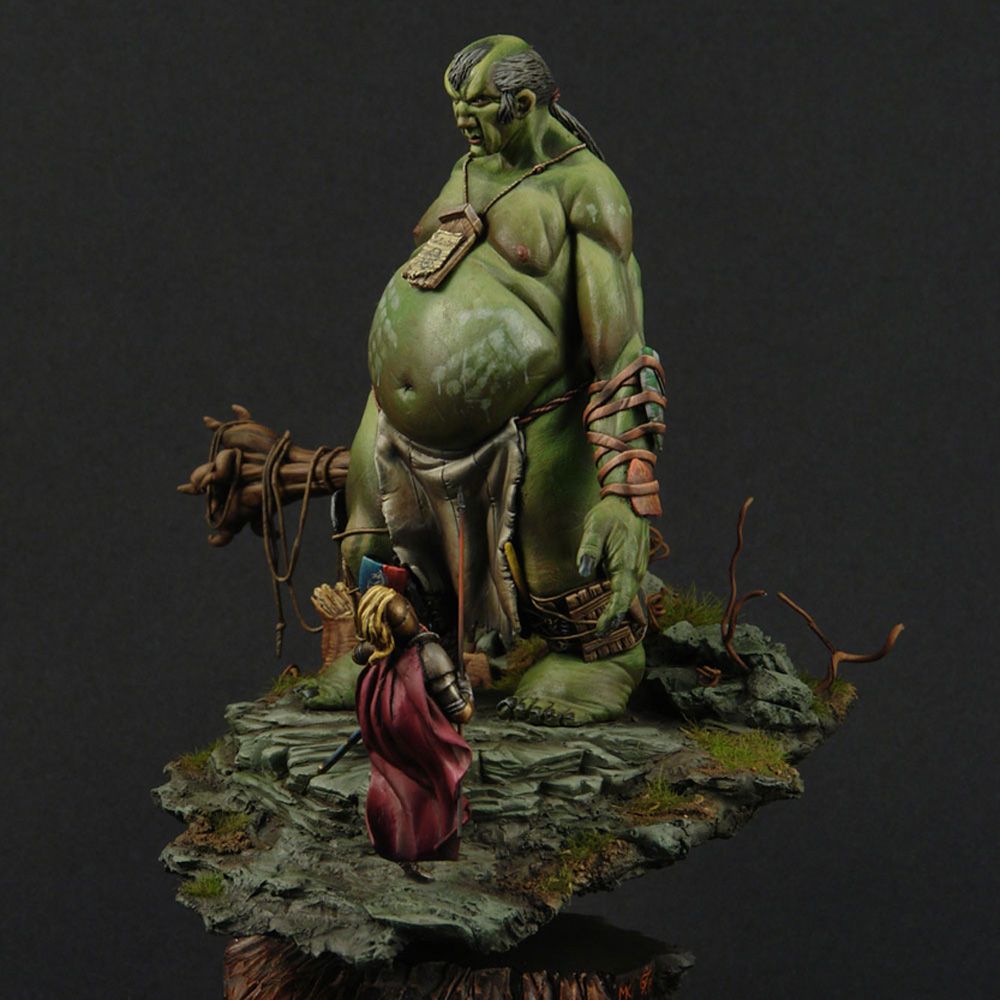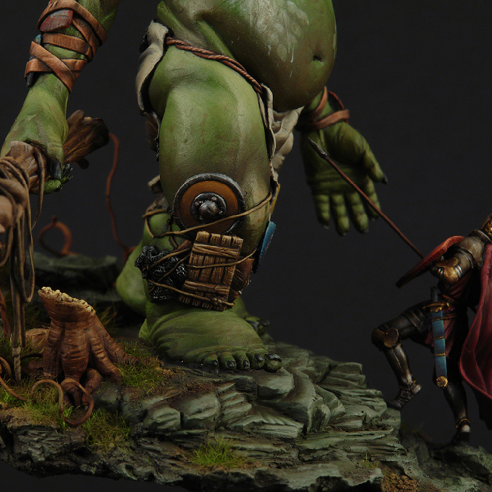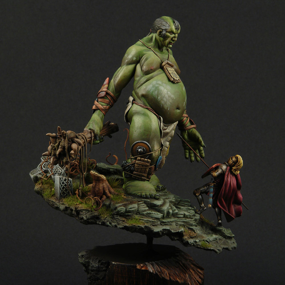 The giant’s anatomy is the fascinating and outstanding feature of the sculpt. Fat and short legs for balance, long arms so he doesn’t have to bend over when he wants to grab something (since he is very tall), huge belly since he eats a lot and a small head because he has such a small brain. The shields of defeated knights adorn his arms and legs for protection and he always carries with him a snack or two (2 sacks with food and a horses leg).