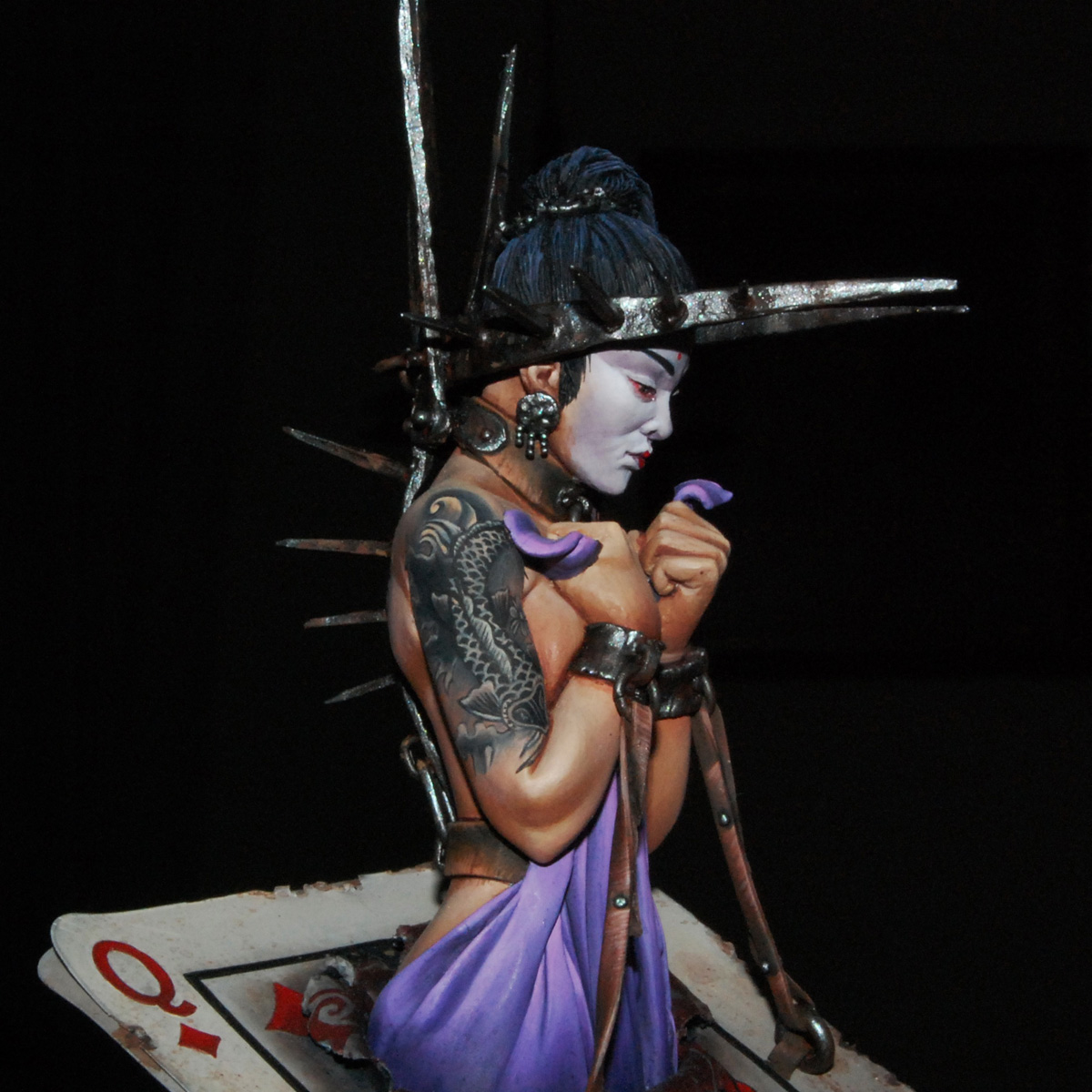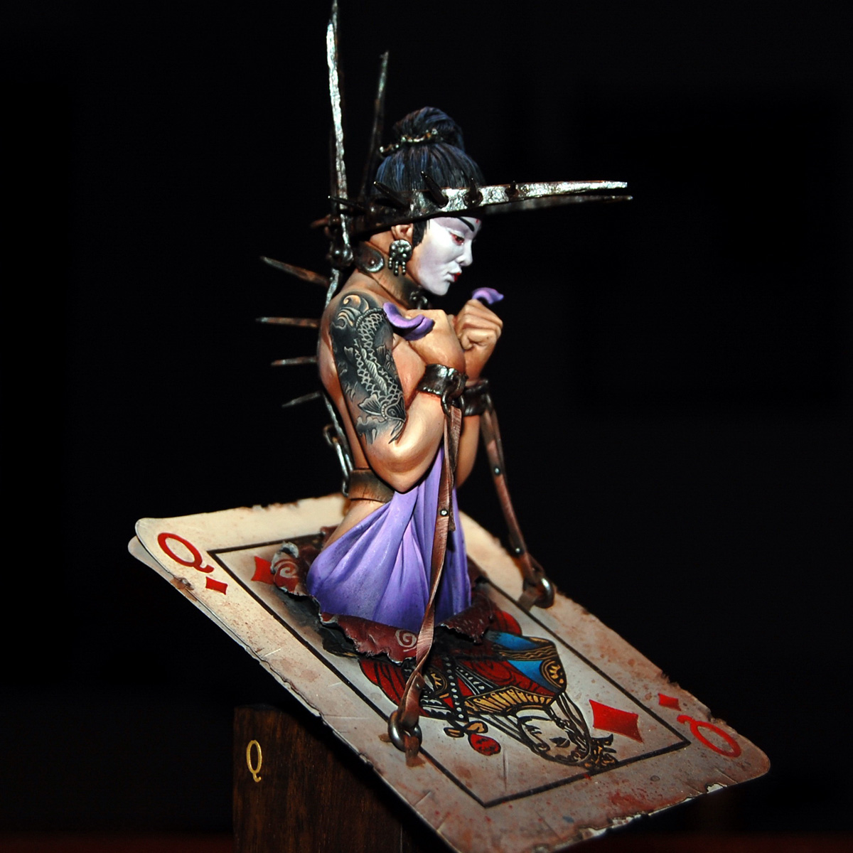 The third bust in a series inspired by characters from a traditional deck of playing cards - Four figures sitting on top of the King of Hearts, the Queen of Diamonds, the Jack of Clubs and the Ace of Spades. The queen, monarch or sovereign carries a heavy burden and appealing as the crown might seem it can be the tool of your demise. This once powerful oriental queen is now in shackles... Her crown, instead of being a symbol of her power, is actually an instrument of her torment.