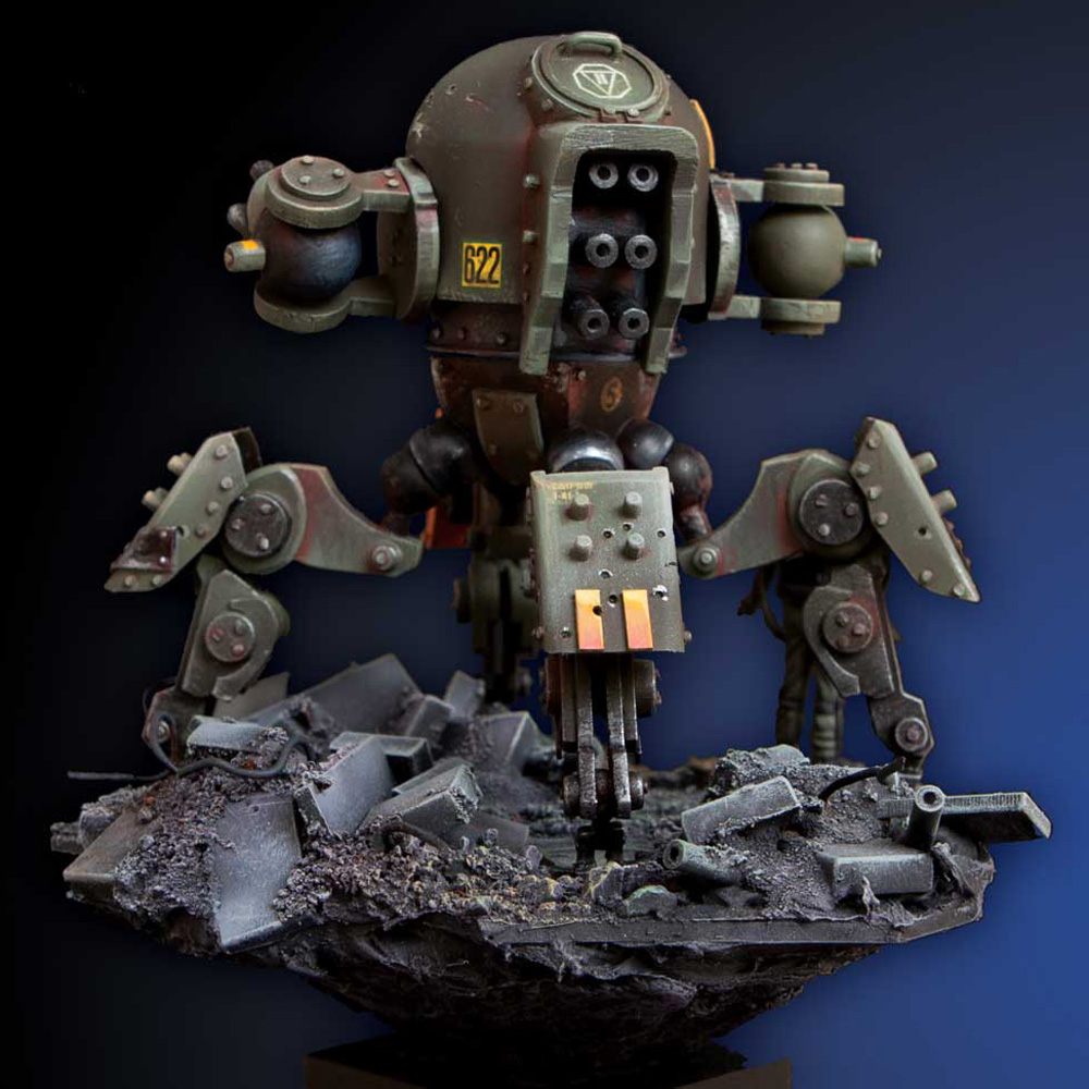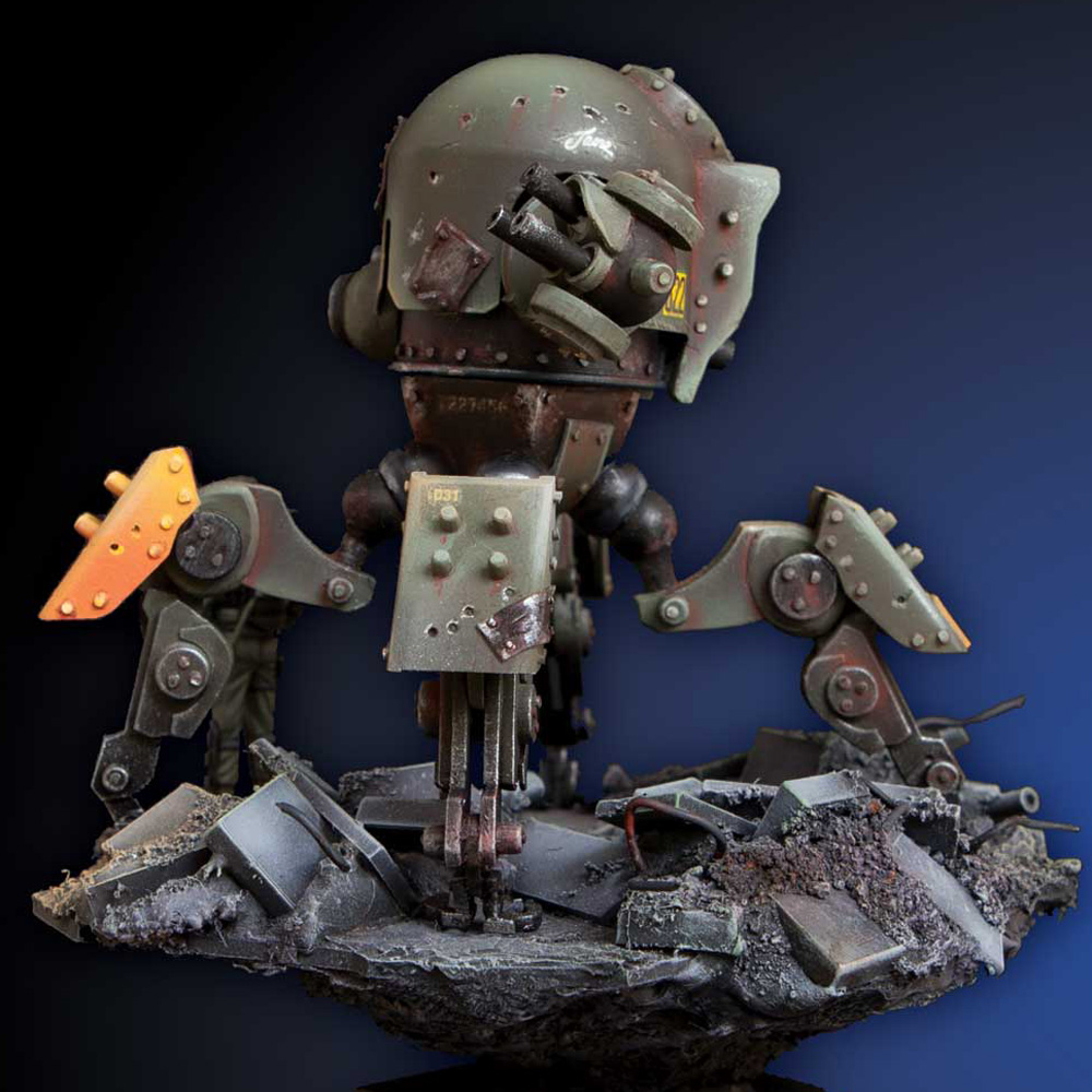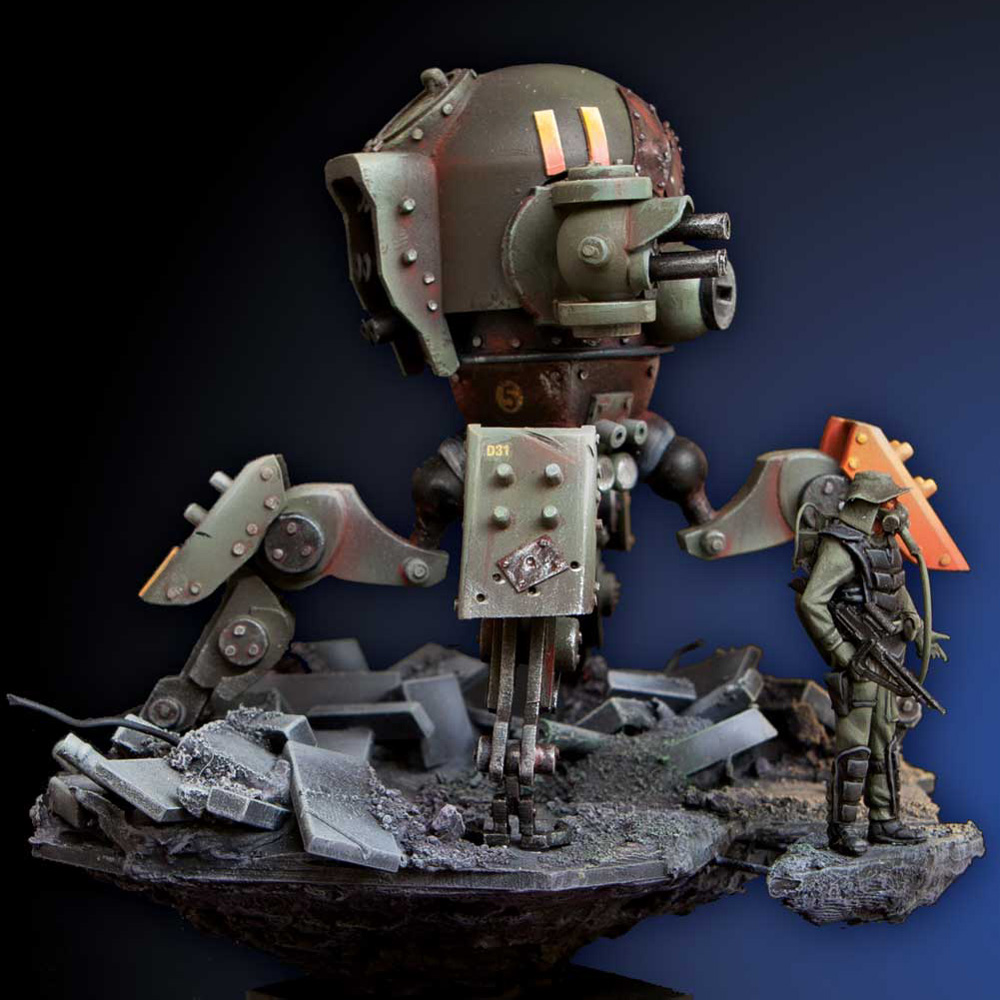Over the years she has hoarded and collected scrap pieces from abandoned vehicles, machines, and weapons. Things were getting out of hand, so she needed more protection than a poxy knife or measly gun. She needed a hunter killer at her side, a robot with murderous instincts that would execute her every command.