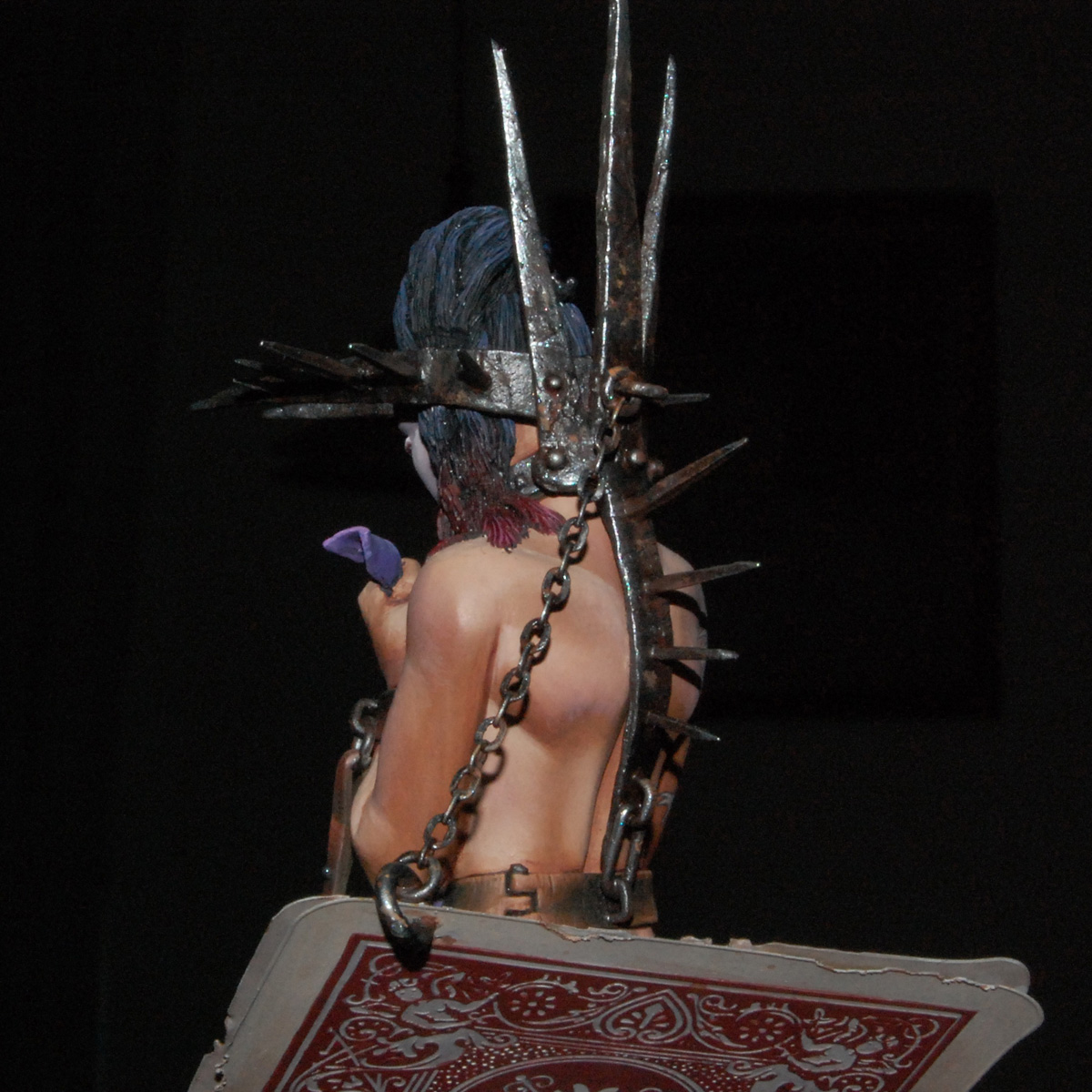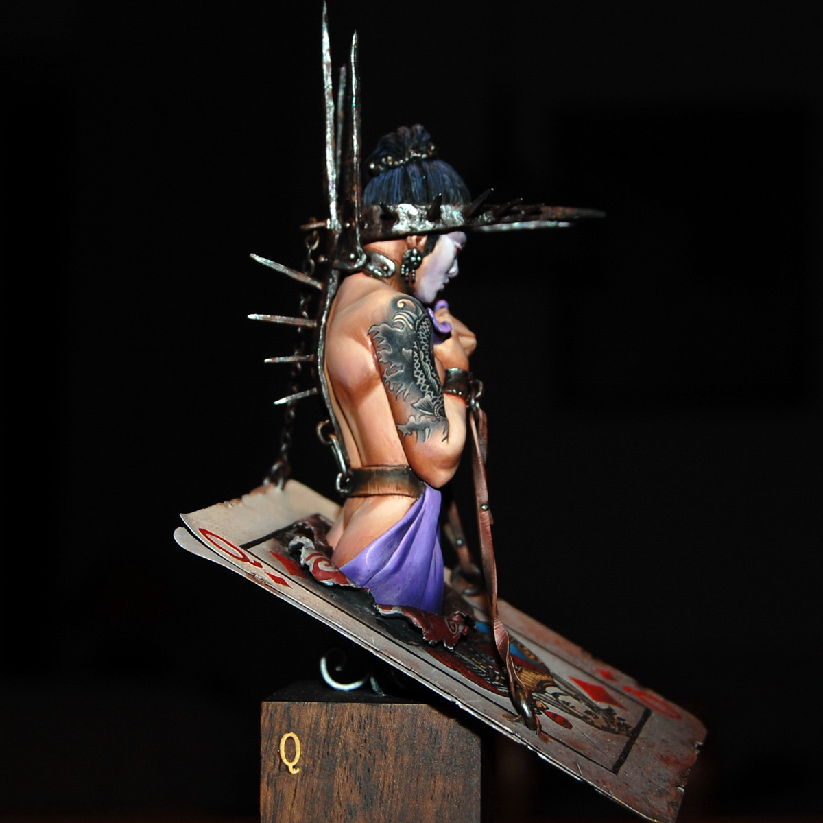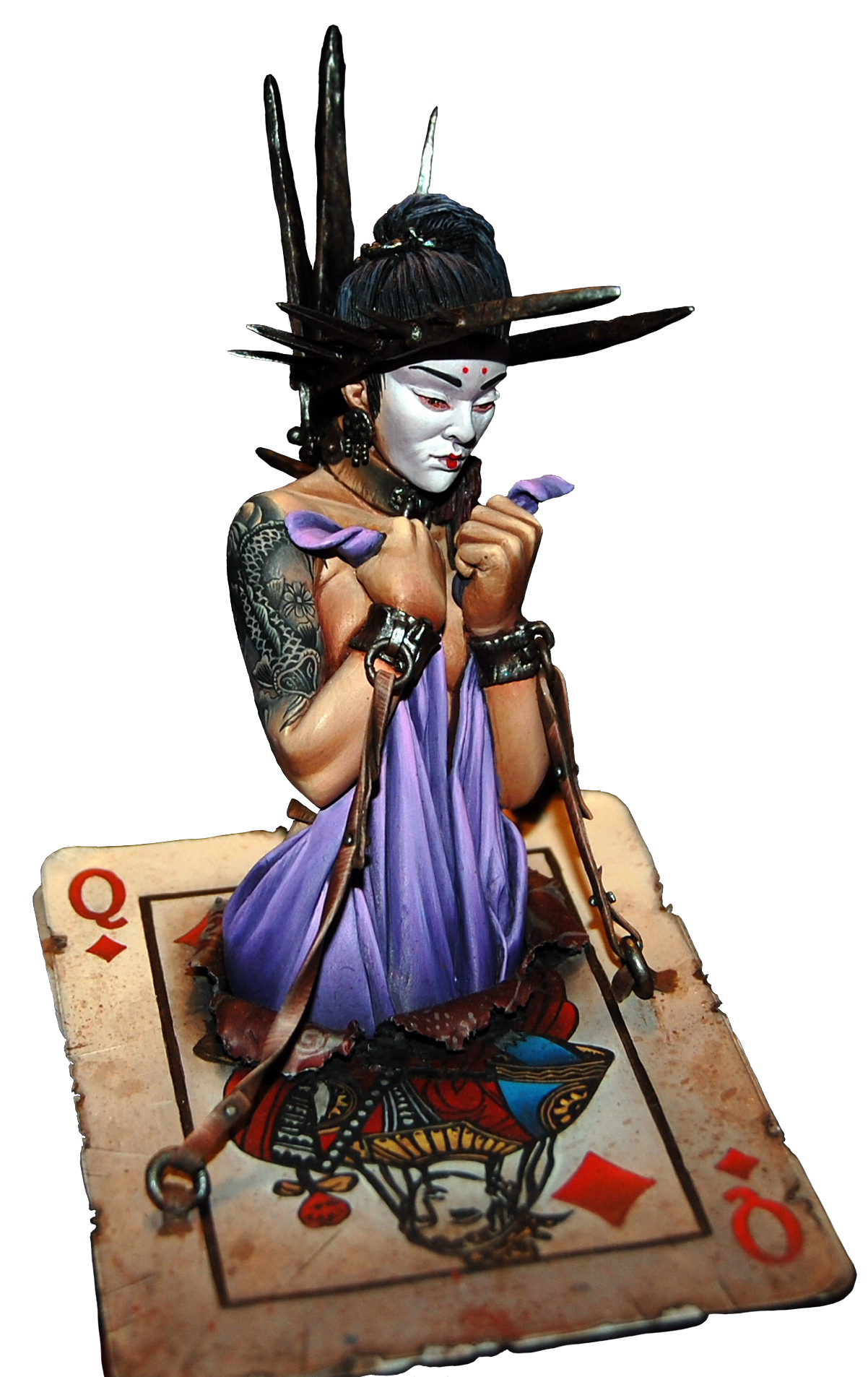 The third bust in a series inspired by characters from a traditional deck of playing cards - Four figures sitting on top of the King of Hearts, the Queen of Diamonds, the Jack of Clubs and the Ace of Spades. The queen, monarch or sovereign carries a heavy burden and appealing as the crown might seem it can be the tool of your demise. This once powerful oriental queen is now in shackles... Her crown, instead of being a symbol of her power, is actually an instrument of her torment.
