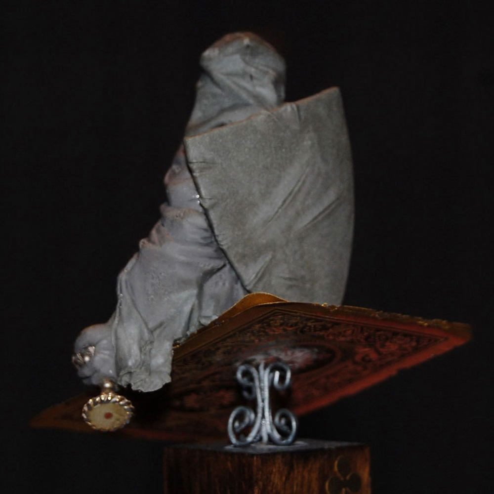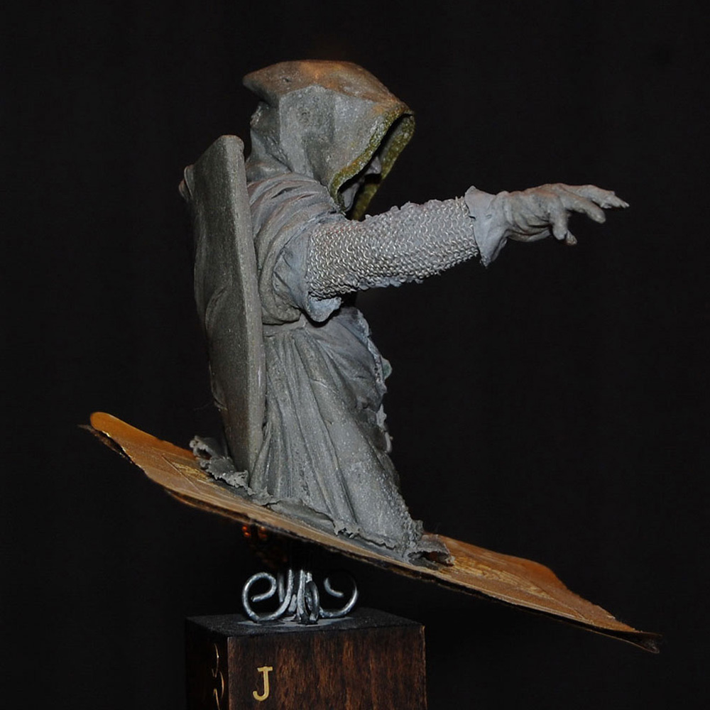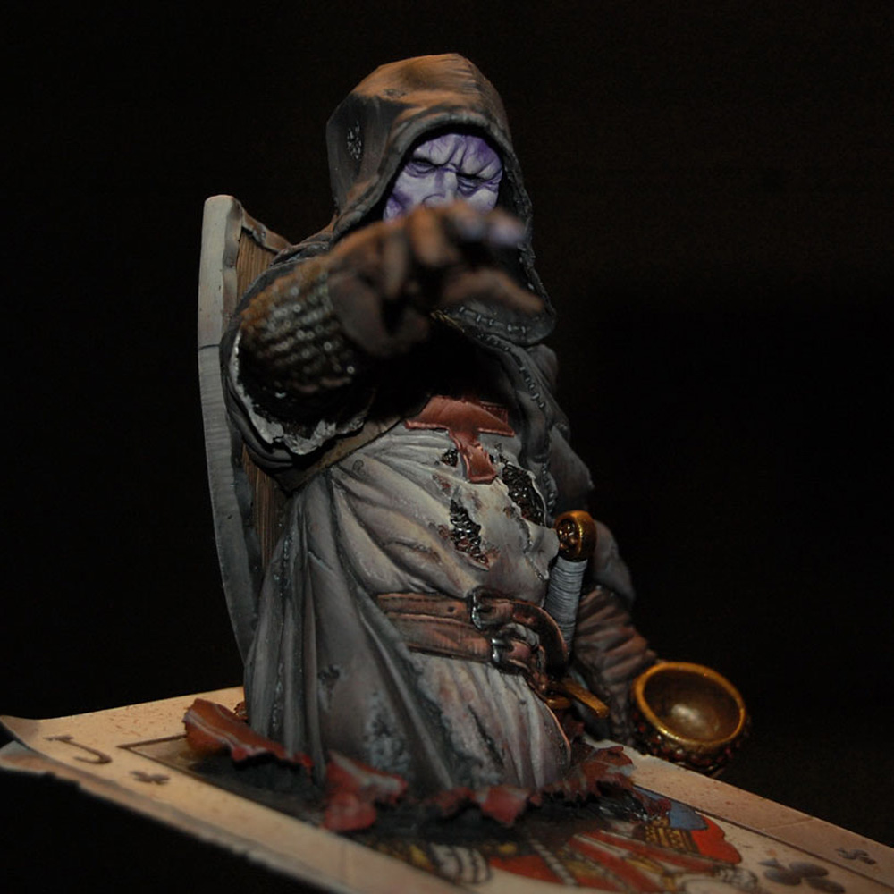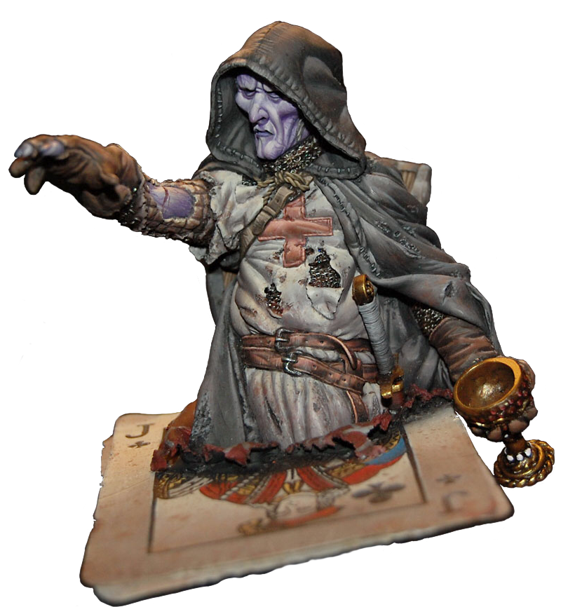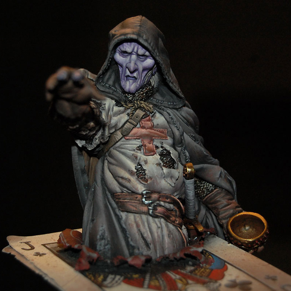 The second bust in a series inspired by characters from a traditional deck of playing cards - Four figures sitting on top of the King of Hearts, the Queen of Diamonds, the Jack of Clubs and the Ace of Spades. The jack, knight or warrior is governed by his principles and high ethical standards, but were the causes he fought for so vehemently always just? Haunted by his deeds this undead ghost-like crusader questions the morals and motives behind the so-called "holy" crusades.